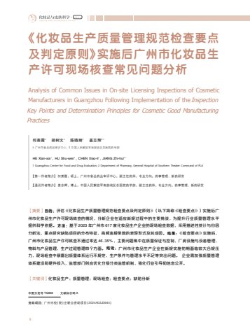 %uff18%u8d44%u52a9%u9879%u76ee%uff1a%u5e7f%u5dde%u5e02%u6821%uff08%u9662%uff09%u4f01%u8054%u5408%u8d44%u52a9%u9879%u76ee%uff08%uff12%uff10%uff12%uff14%uff21%uff10%uff13%uff2a%uff10%uff16%uff14%uff14%uff09%u300a%u5316%u5986%u54c1%u751f%u4ea7%u8d28%u91cf%u7ba1%u7406%u89c4%u8303%u68c0%u67e5%u8981%u70b9%u53ca%u5224%u5b9a%u539f%u5219%u300b%u5b9e%u65bd%u540e%u5e7f%u5dde%u5e02%u5316%u5986%u54c1%u751f%u4ea7%u8bb8%u53ef%u73b0%u573a%u6838%u67e5%u5e38%u89c1%u95ee%u9898%u5206%u6790AnalysisofCommonIssuesinOn%ue011siteLicensingInspectionsofCosmeticManufacturersinGuangzhouFollowingImplementationoftheInspectionKeyPointsandDeterminationPrinciplesforCosmeticGoodManufacturingPractices%u4f55%u7fa1%u971e%uff11 %u80e1%u6811%u6587%uff11 %u9648%u6653%u4e3d%uff11 %u59dc%u5fd7%u8f89%uff12%ue012%uff11%u5e7f%u5dde%u5e02%u98df%u54c1%u836f%u54c1%u5ba1%u8bc4%u4e2d%u5fc3%uff1b%uff12%u4e2d%u56fd%u4eba%u6c11%u89e3%u653e%u519b%u5357%u90e8%u6218%u533a%u603b%u533b%u9662%u836f%u5b66%u90e8%uff28%uff25%uff38%uff49%uff41%uff4e%ue011%uff58%uff49%uff41%uff11%uff0c%uff28%uff35%uff33%uff48%uff55%ue011%uff57%uff45%uff4e%uff11%uff0c%uff23%uff28%uff25%uff2e%uff38%uff49%uff41%uff4f%ue011%uff4c%uff49%uff11%uff0c%uff2a%uff29%uff21%uff2e%uff27%uff3a%uff48%uff49%ue011%uff48%uff55%uff49%uff12%ue0121GuangzhouCenterforFoodandDrugEvaluation;2DepartmentofPharmacy,GeneralHospitalofSouthernTheaterCommandofPLA%u3010%u7b2c%u4e00%u4f5c%u8005%u7b80%u4ecb%u3011%u4f55%u7fa1%u971e%uff0c%u7855%u58eb%uff0c%u5e7f%u5dde%u5e02%u98df%u54c1%u836f%u54c1%u5ba1%u8bc4%u4e2d%u5fc3%uff0c%u526f%u4e3b%u4efb%u836f%u5e08%u3002%u4e13%u4e1a%u65b9%u5411%uff1a%u836f%u4e8b%u7ba1%u7406%u3001%u65b0%u836f%u7814%u53d1%u3010%u901a%u8baf%u4f5c%u8005%u7b80%u4ecb%u3011%u59dc%u5fd7%u8f89%uff0c%u535a%u58eb%uff0c%u4e2d%u56fd%u4eba%u6c11%u89e3%u653e%u519b%u5357%u90e8%u6218%u533a%u603b%u533b%u9662%u836f%u5b66%u90e8%uff0c%u526f%u4e3b%u4efb%u836f%u5e08%u3002%u4e13%u4e1a%u65b9%u5411%uff1a%u836f%u4e8b%u7ba1%u7406%u3001%u65b0%u836f%u7814%u53d1%u3010%u6458%u8981%u3011%u76ee%u7684%uff1a%u8bc4%u4f30%u300a%u5316%u5986%u54c1%u751f%u4ea7%u8d28%u91cf%u7ba1%u7406%u89c4%u8303%u68c0%u67e5%u8981%u70b9%u53ca%u5224%u5b9a%u539f%u5219%u300b%uff08%u4ee5%u4e0b%u7b80%u79f0%u300a%u68c0%u67e5%u8981%u70b9%u300b%uff09%u5b9e%u65bd%u540e%u5e7f%u5dde%u5e02%u5316%u5986%u54c1%u751f%u4ea7%u8bb8%u53ef%u73b0%u573a%u6838%u67e5%u7684%u60c5%u51b5%uff0c%u5206%u6790%u4f01%u4e1a%u5728%u9002%u5e94%u65b0%u89c4%u8fc7%u7a0b%u4e2d%u7684%u4e3b%u8981%u6311%u6218%uff0c%u4e3a%u63d0%u5347%u884c%u4e1a%u8d28%u91cf%u7ba1%u7406%u6c34%u5e73%u63d0%u4f9b%u79d1%u5b66%u4f9d%u636e%u3002%u65b9%u6cd5%uff1a%u57fa%u4e8e %uff12%uff10%uff12%uff13%u5e74%u5e7f%u5dde%u5e02 %uff16%uff11%uff17%u5bb6%u5316%u5986%u54c1%u751f%u4ea7%u4f01%u4e1a%u7684%u73b0%u573a%u68c0%u67e5%u6570%u636e%uff0c%u91c7%u7528%u63cf%u8ff0%u6027%u7edf%u8ba1%u4e0e%u5f52%u56e0%u5206%u6790%u6cd5%uff0c%u91cd%u70b9%u7814%u7a76%u7f3a%u9677%u9879%u76ee%u7684%u5206%u5e03%u7279%u5f81%u3001%u9ad8%u9891%u8fdd%u89c4%u6761%u6b3e%u7684%u8868%u73b0%u5f62%u5f0f%u53ca%u5176%u6210%u56e0%u3002%u7ed3%u679c%uff1a%u300a%u68c0%u67e5%u8981%u70b9%u300b%u5b9e%u65bd%u540e%uff0c%u5e7f%u5dde%u5e02%u5316%u5986%u54c1%u751f%u4ea7%u8bb8%u53ef%u6838%u67e5%u4e0d%u901a%u8fc7%u7387%u8fbe %uff14%uff16%uff0e%uff13%uff15%uff05%uff0c%u4e3b%u8981%u95ee%u9898%u96c6%u4e2d%u5728%u8d28%u91cf%u4fdd%u8bc1%u4e0e%u63a7%u5236%u3001%u5382%u623f%u8bbe%u65bd%u4e0e%u8bbe%u5907%u7ba1%u7406%u3001%u7269%u6599%u4e0e%u4ea7%u54c1%u7ba1%u7406%u3001%u751f%u4ea7%u8fc7%u7a0b%u7ba1%u7406%u56db%u4e2a%u65b9%u9762%u3002%u7ed3%u8bba%uff1a%u5e7f%u5dde%u5e02%u5316%u5986%u54c1%u751f%u4ea7%u4f01%u4e1a%u5728%u65b0%u89c4%u5b9e%u65bd%u521d%u671f%u9762%u4e34%u8f83%u5927%u5408%u89c4%u538b%u529b%uff0c%u73b0%u573a%u68c0%u67e5%u4e2d%u66b4%u9732%u51fa%u8d28%u91cf%u4f53%u7cfb%u8fd0%u884c%u4e0d%u89c4%u8303%u3001%u751f%u4ea7%u6761%u4ef6%u4e0e%u7ba1%u7406%u6c34%u5e73%u4e0d%u8db3%u7b49%u7a81%u51fa%u95ee%u9898%u3002 %u4f01%u4e1a%u9700%u52a0%u5f3a%u8d28%u91cf%u7ba1%u7406%u4f53%u7cfb%u5efa%u8bbe%u548c%u786c%u4ef6%u6295%u5165%uff0c%u76d1%u7ba1%u90e8%u95e8%u5219%u5e94%u4f18%u5316%u5206%u7ea7%u5206%u7c7b%u76d1%u7ba1%u673a%u5236%u3001%u5f3a%u5316%u884c%u4e1a%u5f15%u5bfc%u548c%u4fe1%u606f%u516c%u5f00%u3002%u3010%u5173%u952e%u8bcd%u3011%u5316%u5986%u54c1%u751f%u4ea7%uff1b%u8d28%u91cf%u7ba1%u7406%uff1b%u73b0%u573a%u68c0%u67e5%uff1b%u68c0%u67e5%u8981%u70b9%uff1b%u7f3a%u9677%u5206%u6790%u4e2d%u56fe%u5206%u7c7b%u53f7 %uff34%uff31%uff16%uff15%uff18 %u6587%u732e%u6807%u5fd7%u7801 %uff21
